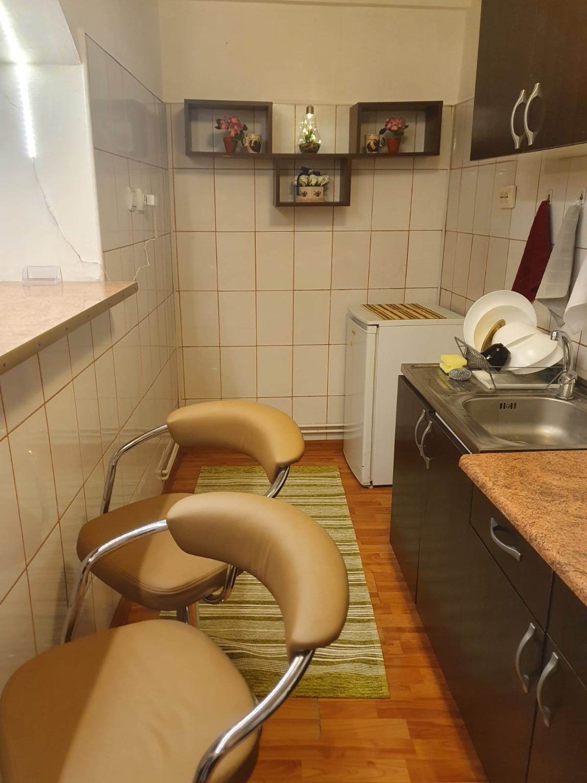 De asemenea, studio Jorj este dotat cu TV, wi-fi, mașină de spălat, uscător de păr, cosmetice hoteliere, aragaz, veselă, frigider, fierbător, bar.